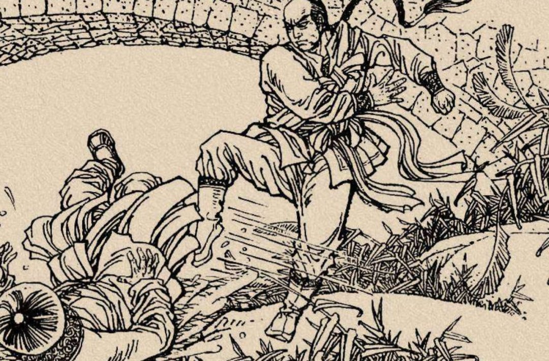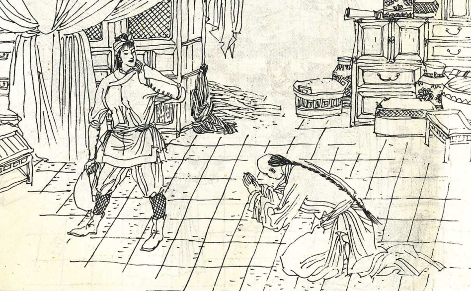 快到大门的时候,忽然一枝铁拐当头飞下。此时,金莲手中再无其他兵器,情急之下只好一脚将丈夫踢出了门,用后背硬生生扛住了铁拐。喉头一甜,当场吐出一口鲜血,跪在了地上。