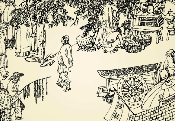 徐尚书站在巷子口向城外张望,不一会儿,听到小车吱哽吱哽的响声,由远及近,只见一个推了满满一车棒槌的人向这里走来。