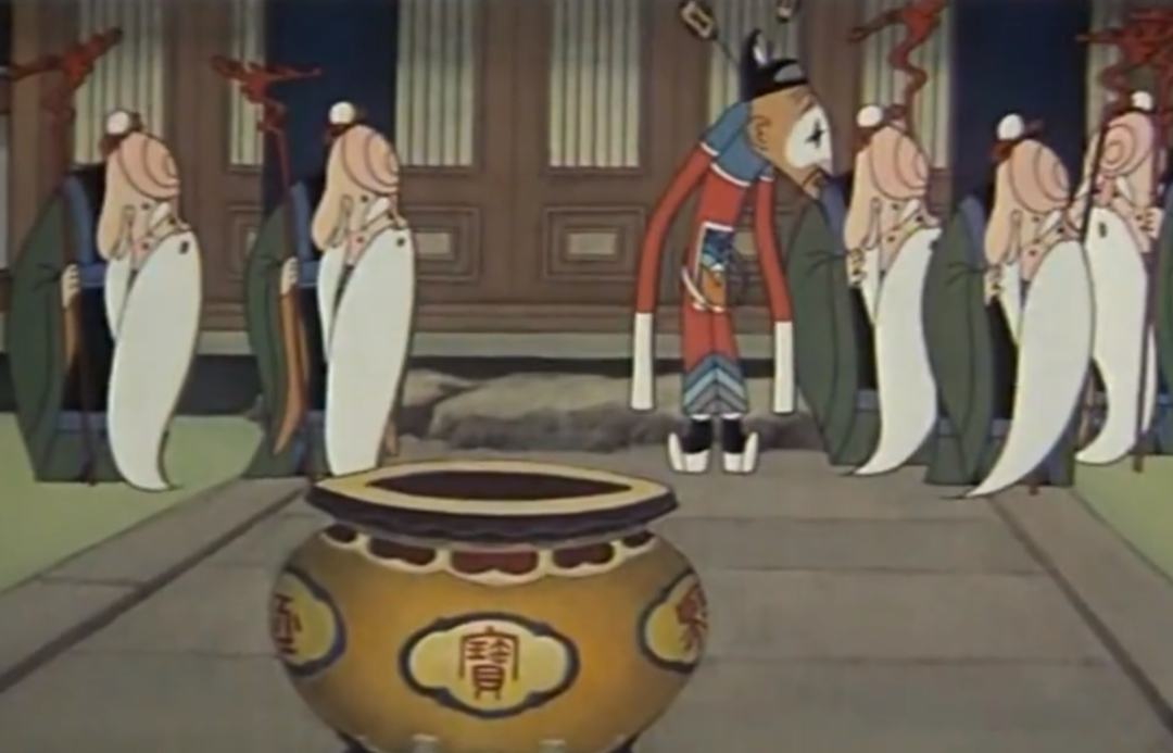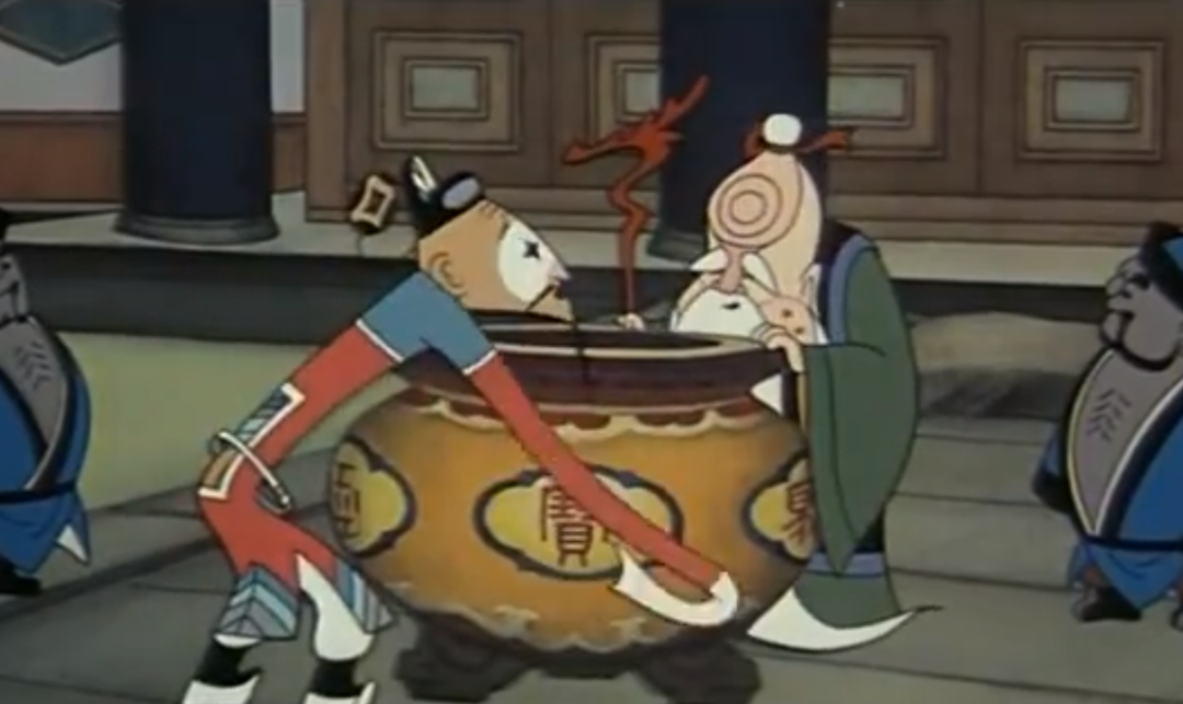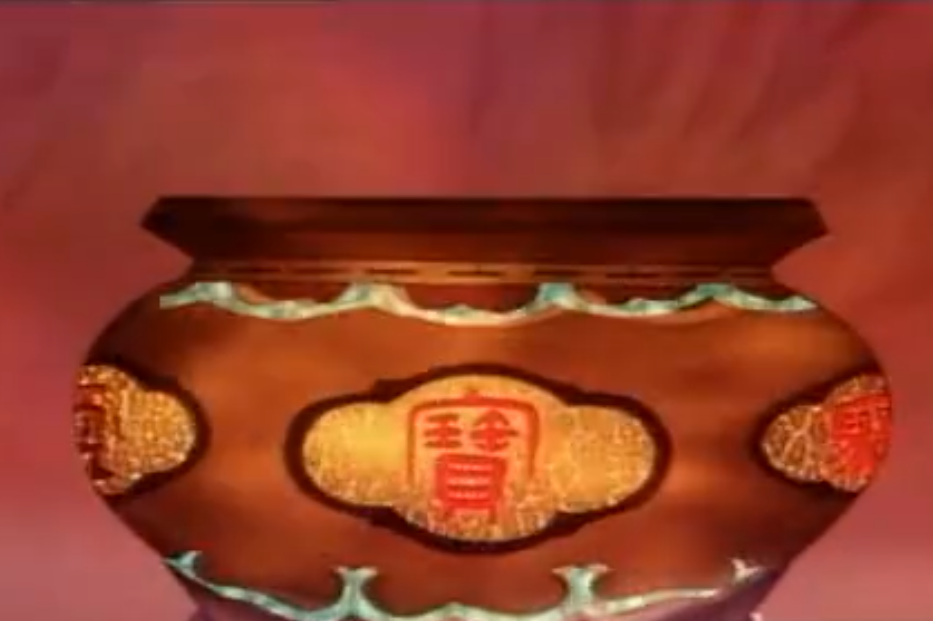 孟良不敢违拗,只能把聚宝盆端了出来,县官看见宝贝金光闪闪,万分喜悦,立刻让衙役拿走。