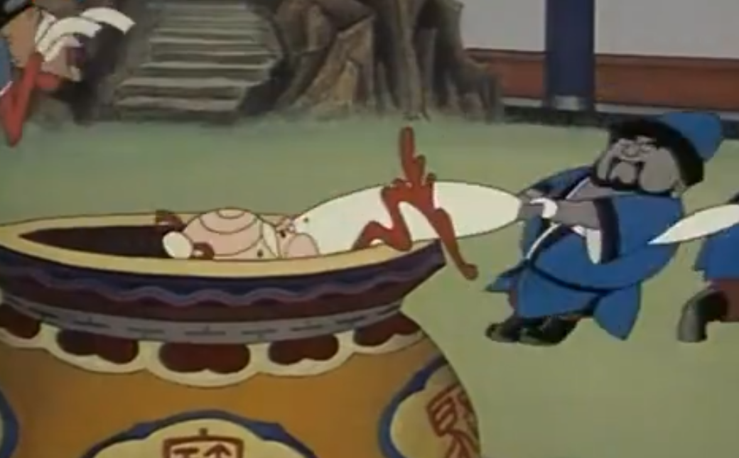 县官怒气冲天,一边斥责孟良,一边赶紧把老头从盆子里往外拉。