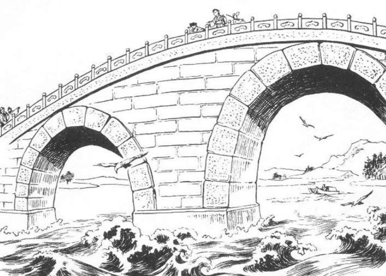 说来也奇怪,这块大石头在空中转了三圈,“吧嗒”一声,不偏不斜正好落到没铺的那块桥面上。不薄不厚,不大不小,严丝合缝,铺个正好。