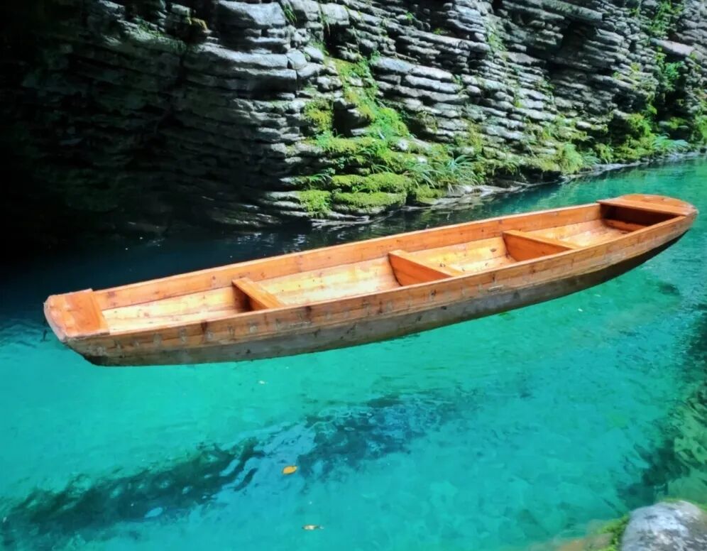 峡谷中的水,有了玻璃的透明,浮在水面上的小船,如梦如幻,水中的温度正好,有着夏日的清凉。