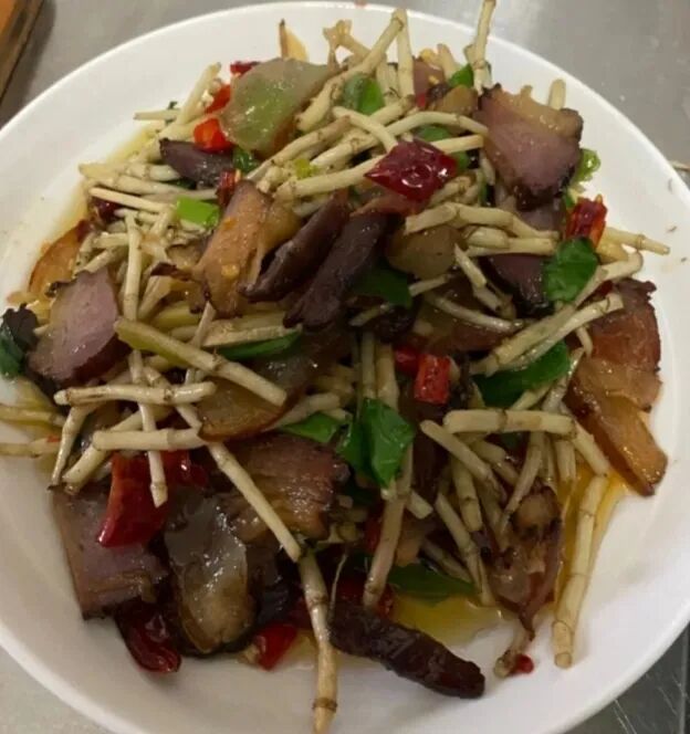 这里的腊肉,不只是在太阳底下晾晒,而是在烟熏好之后,经过自然风干,更加香气十足了,配上折耳根,或是腊肉炒竹笋,都成了一道可口的菜肴。