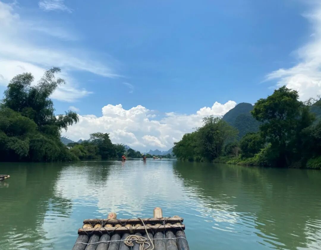 坐在了竹筏上,游在了小城的山水画卷里,看水中的影子,时而清晰,时而梦幻着,蓝天下游走的白云,也有了美丽的影子,一草一木,在雨后新生,挂在叶片上的露珠,映下了可爱的世界。