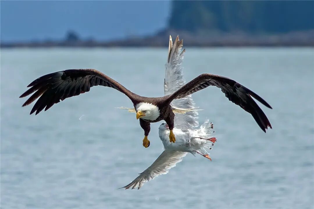 平静的海面上,一只海鸥冲下水去捕捞鲱鱼,哪知它一心只想着水里的鲱鱼,根本就没注意到空中潜在的危险。刚叼着鲱鱼飞上天空,一只饥肠辘辘的白头海雕,就在自己的身后,正虎视眈眈地盯着它。