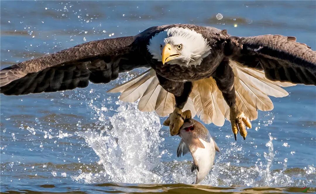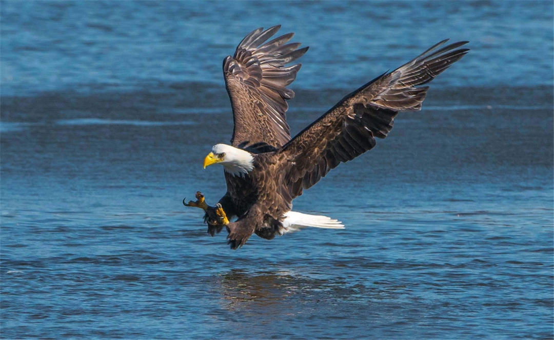 白头海雕的主食是鱼类,它们很擅长捕鱼,会从空中俯冲下去用强有力的利爪把鱼从水里抓出来,当然,饿了的时候也饥不择食,也捕食一些小动物。