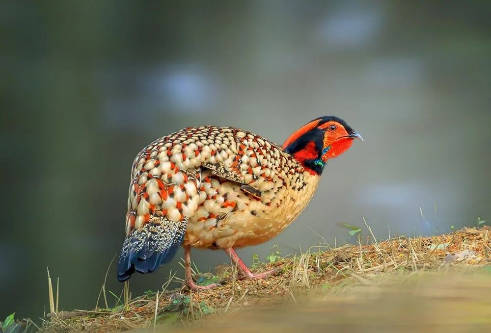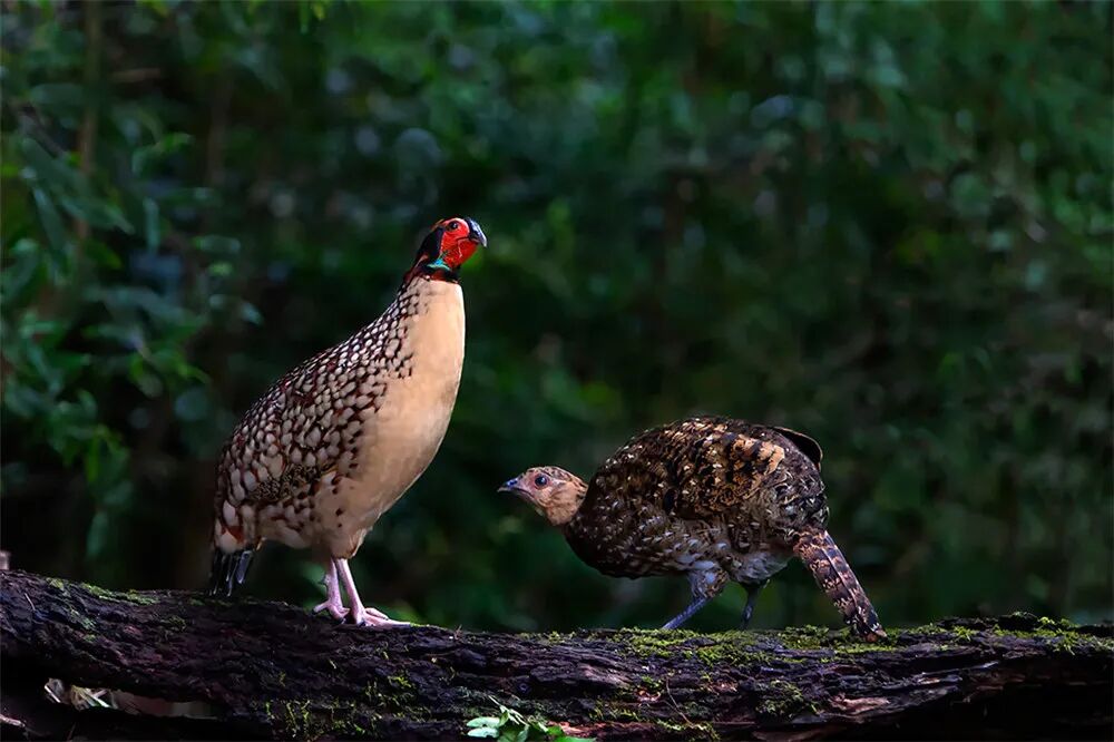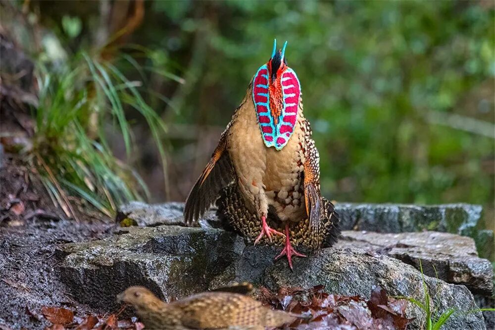 寿鸡的中文学名叫黄腹角雉,与红腹角雉同属于雉科角雉属,有着相似的形态与习性。繁殖季,也是雄性寿鸡的颜值达到巅峰的时期,而雌性总是灰扑扑的样子,担负着繁育下一代的重大职责。