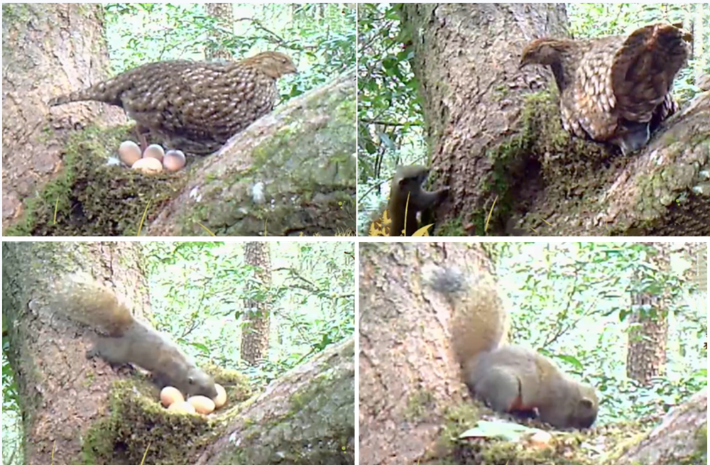 当雌鸡不得不出去觅食果腹时,赤腹松鼠熟门熟路抱着树干爬上来了,看到巢穴里4个又大又圆的蛋,特别兴奋,嗅嗅这只,摸摸那只,还张大嘴巴想吃。