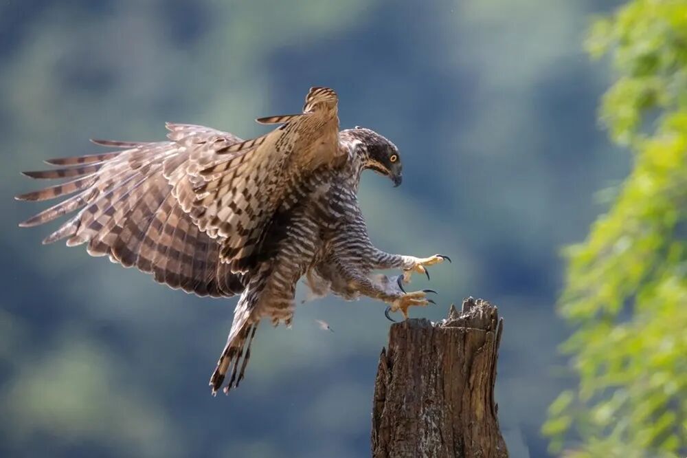 鹰雕站在树梢上不动时,低调不显眼,羽毛起到很好的隐蔽效果。当它起飞时,腹部的斑纹却显得十分斑斓。这只鹰雕在森林里飞翔,面对生活在这里的鸟类,从没有退缩过。