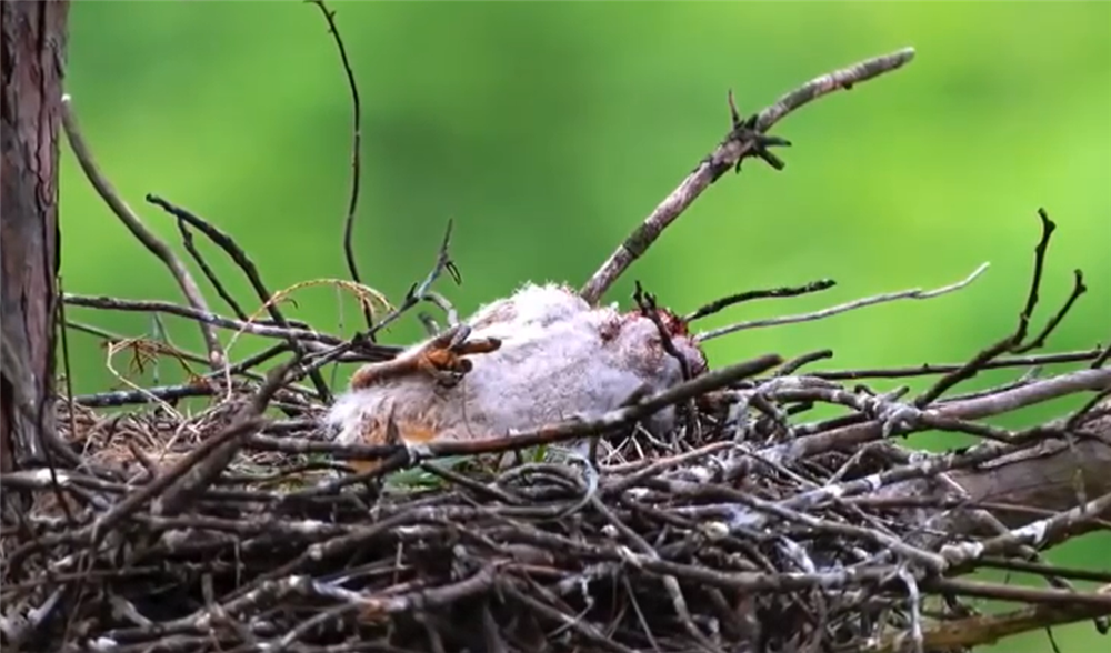 鹰雕飞走了,2只朱鹮终于可以飞入自己的巢穴,却发现幼鸟身上带血,蜷缩在巢里一动不动的。鹰雕的喙多坚硬、爪子多锋利啊,幼鸟早已没有了生还的可能。