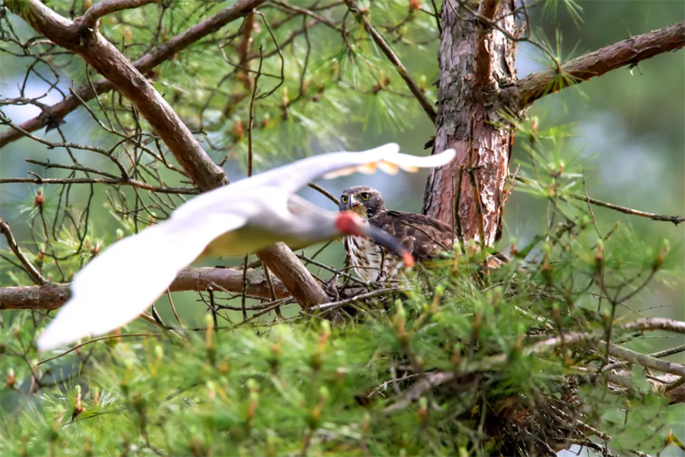 鹰雕站在巢穴里,一爪子踩在幼鸟身上,不愿离开,眼神凶恶地盯着来回飞翔的朱鹮,还张开鸟喙朝朱鹮叫嚣,谁怕谁呀?仿佛朱鹮敢再靠近一点,它就要啄朱鹮。