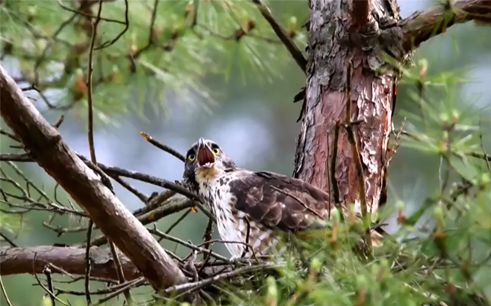 鹰雕立马飞过去,站到巢穴边,收拢起翅膀。朱鹮幼鸟察觉到危险来临,发出受惊的叫声,小小的身体一边发抖,一边往巢穴里边钻。鹰雕可不管,毫不留情地啄了一下幼鸟。
