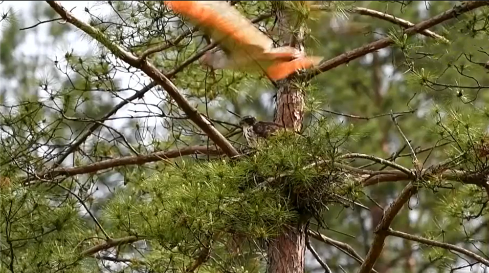 而鹰雕飞了一圈,又回到了这里,可能是没找到吃的,想趁朱鹮亲鸟不在的时候,去偷偷抓走那只被自己啄死的幼鸟。然而,2只朱鹮一直守在巢穴边,鹰雕没有下手的机会。
