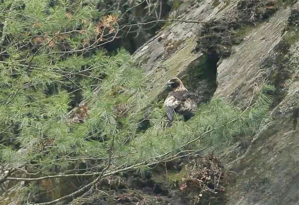 金雕的巢穴筑在悬崖上的岩石间,岩石缝间还长着低矮的植物,隐蔽性相当好。金雕站在巢穴边缘,梳理了一会儿羽毛,就张开翅膀飞出去了,在巢穴上空盘旋了两圈,才向远处飞去。