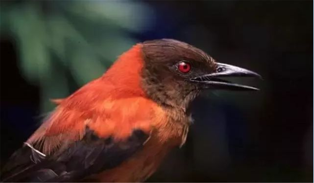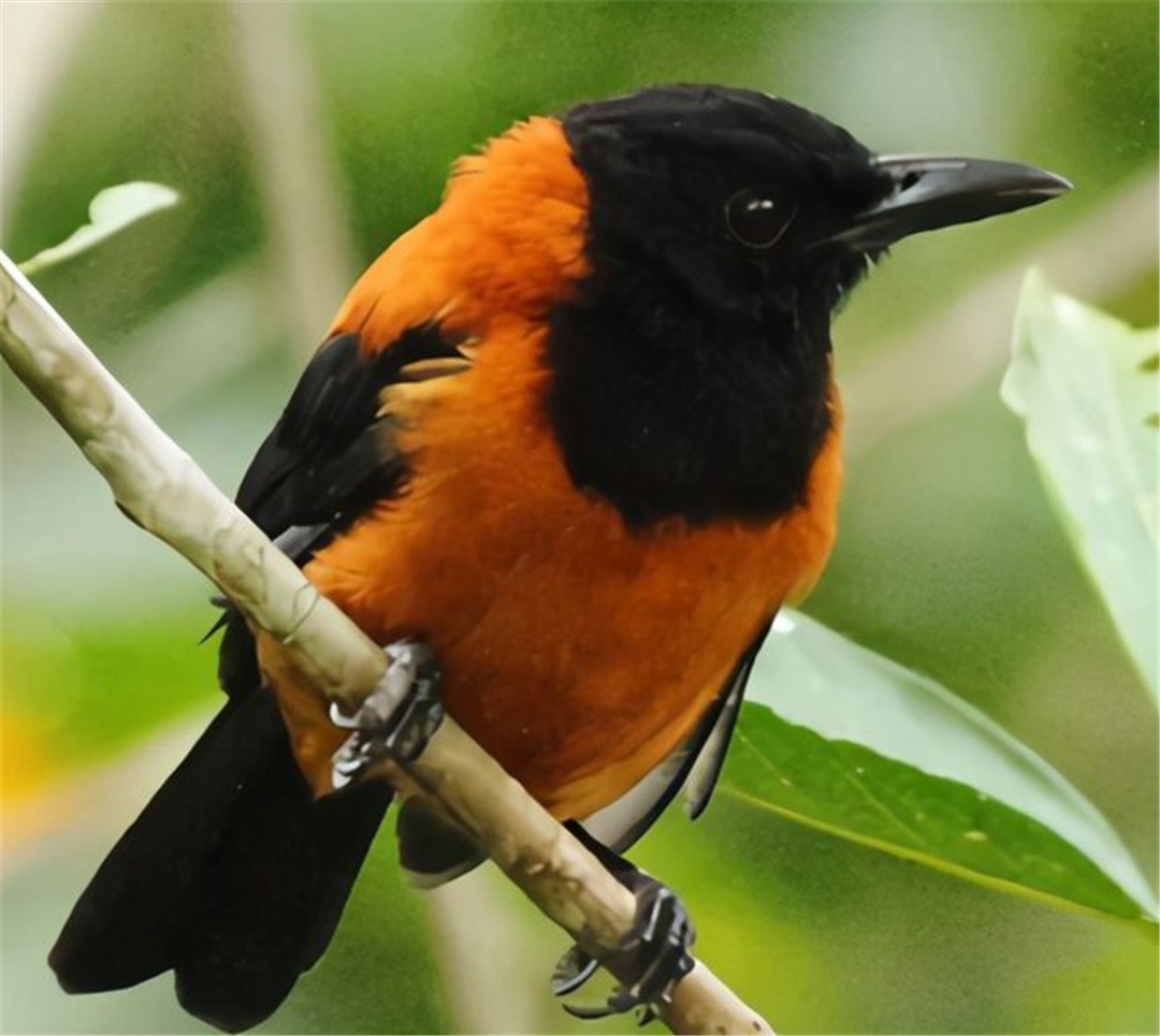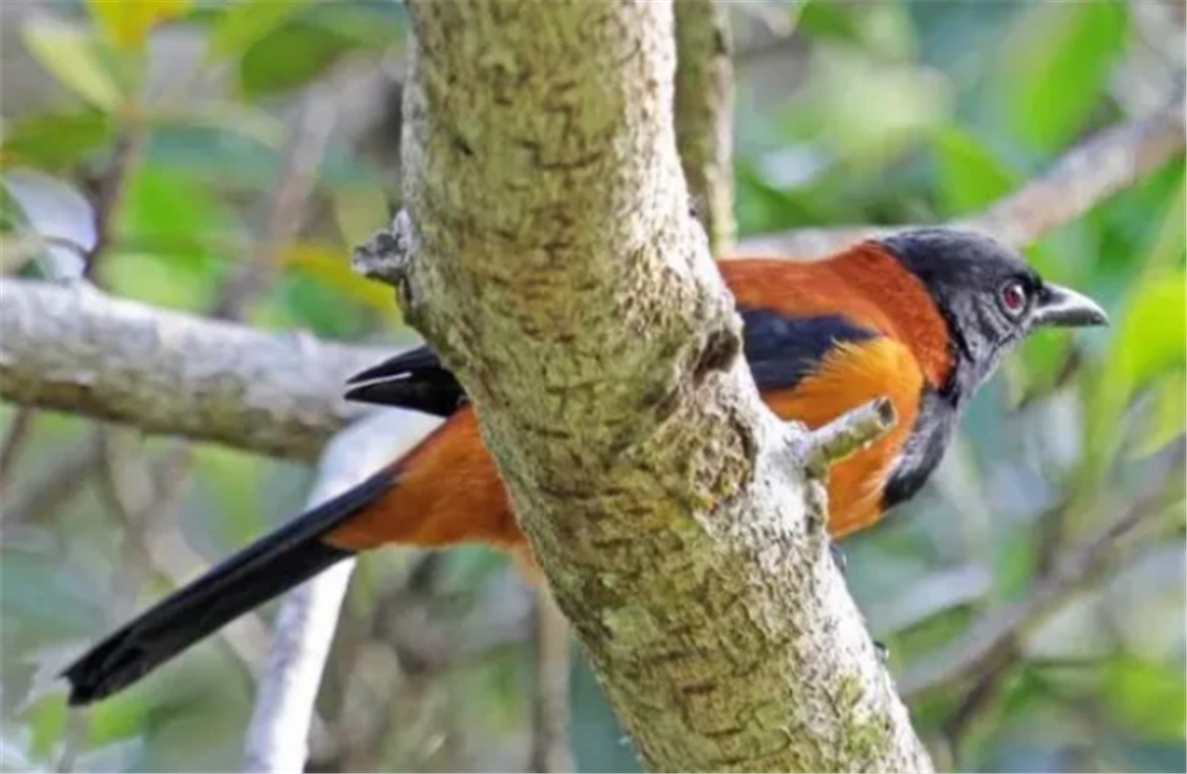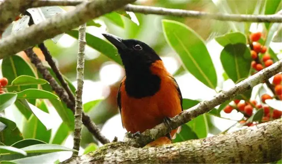 冠林鵙鹟隶属雀形目啸鹟科林鵙鹟属,是一种小型鸣禽。体长约28-33厘米,虽然不像古书中的鸩一样大如秃鹫,但它十分夺目,它确确实实是黑身赤目,一身黑羽。头上披有羽冠,身上长满黑橙相间花纹,腹部和背部呈鲜明的橙色,头部、翅膀、尾巴是油亮的黑色,看起来还挺英武的。