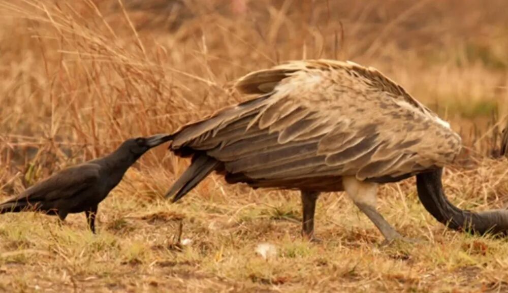 你别看乌鸦比秃鹫小,也没有什么杀伤力,但它们一点也不怕秃鹫,照样上前找空子,时不时偷吃两口。还有胆子大的乌鸦,甚至敢去啄秃鹫的羽毛。