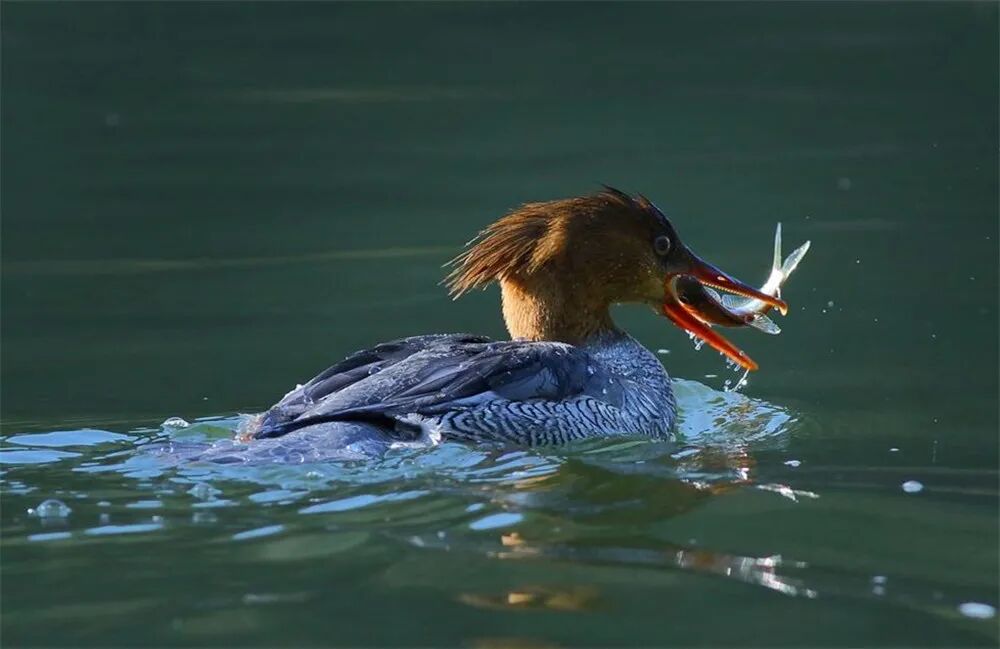 这只雌性中华秋沙鸭观察了一阵子,确定暂时不会有危险,便又继续觅食去了。看到有鱼,只见它上胸离开水面,突然钻入水中,瞬间就衔着一条小鱼浮出水面。
