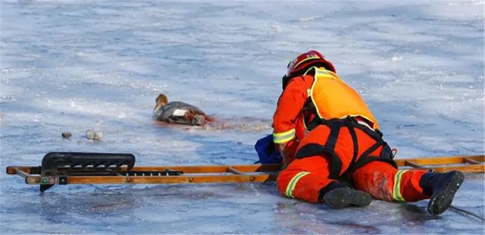 没多久消防员赶来了,利用救援梯,爬行到中华秋沙鸭附近,将它旁边的冰砸碎,并剪断了挂在它嘴里的鱼线,小心翼翼地将中华秋沙鸭救出。