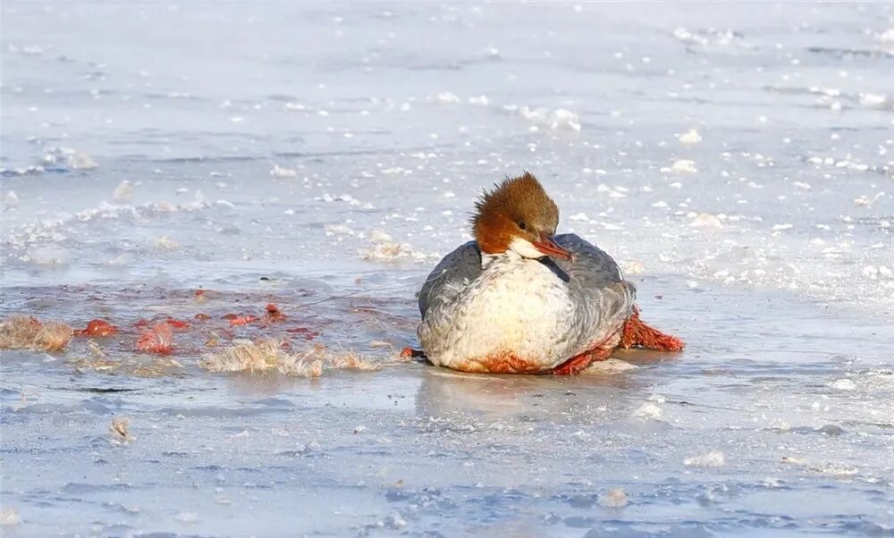 幸运的是,一位摄影师发现了冰河上这只雌性中华秋沙鸭,它距离岸边大约20米,看上去状态也挺糟糕。要知道中华秋沙鸭是濒危物种啊,当即打了救助电话。