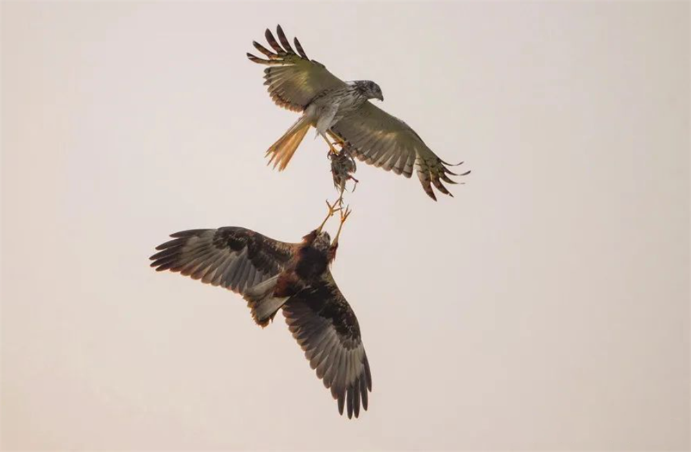 每年的4-6月是白腹鹞的繁殖季,成年的白腹鹞雄鸟,会在空中表演飞行技巧,向雌鸟求偶。如果雌鸟看上了雄鸟,会与雄鸟在空中盘旋,互相追逐,一起去捕猎。