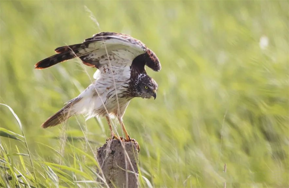 很多猛禽都喜欢住在高处,如金雕非得在高高的悬崖上筑巢,但白腹鹞却不太喜欢高处,休息时落在芦苇丛中,或者直接就站到地上了。