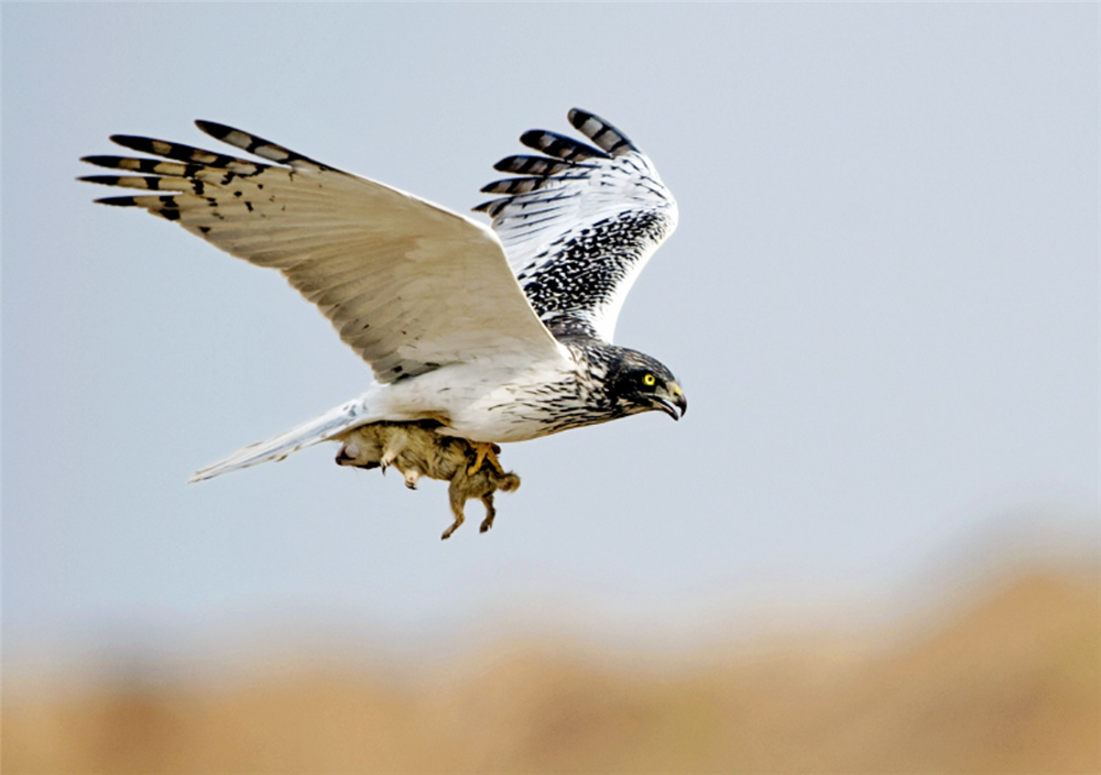 在养育幼鸟期间,白腹鹞雄鸟每天都在疯狂捕食,尤其当幼鸟一天天长大,需要更多食物的时候,雄鸟几乎忙得死去活来。