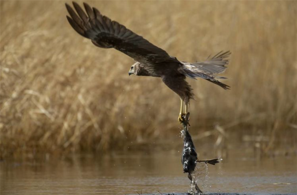 白腹鹞常在湿地沼泽活跃,似乎很了解捕猎对象的习惯,飞快地降落到水面,爪子伸入水中,精准地抓住了没来得及潜水逃跑的小野鸭,小野鸭被紧紧抓住了脑袋,根本没法反抗,就白腹鹞拎出了水面。