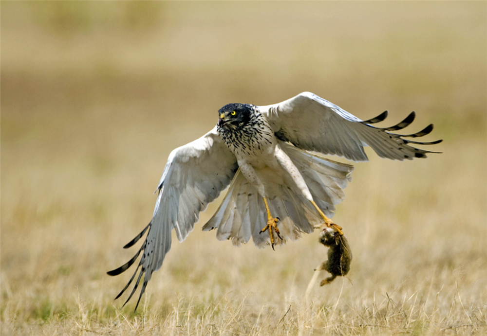 对付水中生活的水鸟都如此快狠准,对付陆地上的鼠类更是不在话下了,瞄准目标后,飞快降落,一把抓住一只老鼠,又起飞回到空中。这系列捕猎的动作,瞬间就完成了。