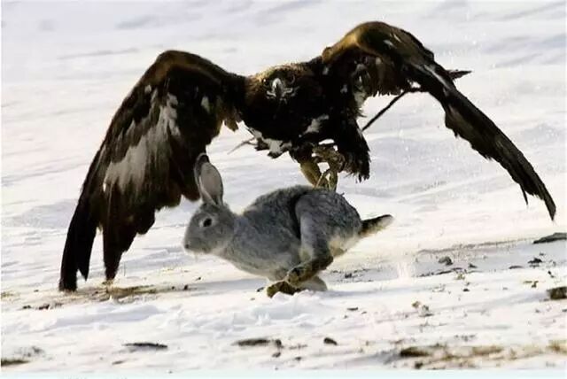 昆仑山西段多为山地荒漠和高寒荒漠,向来人迹罕至,只有极少数的牧民生活在这里。这天中午时分,60多岁的老牧民买汗买提,想把自家的羊群赶回羊圈。突然,在他前面的山崖上,不知道从哪里飞出来一只“老鹰”,快速冲进一个洞穴中,不一会儿,一只野兔从洞中跑了出来。洞外,一只伪装成岩石的“老鹰”躲在不远处,见到野兔逃出来,直接飞上去扑杀,本以为逃脱魔爪的野兔就这样不明不白掉进别人的嘴里。