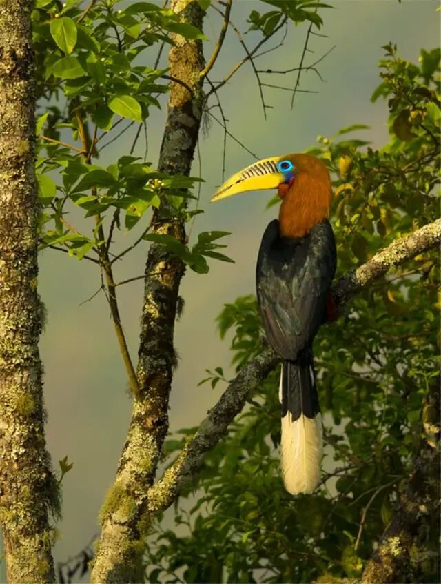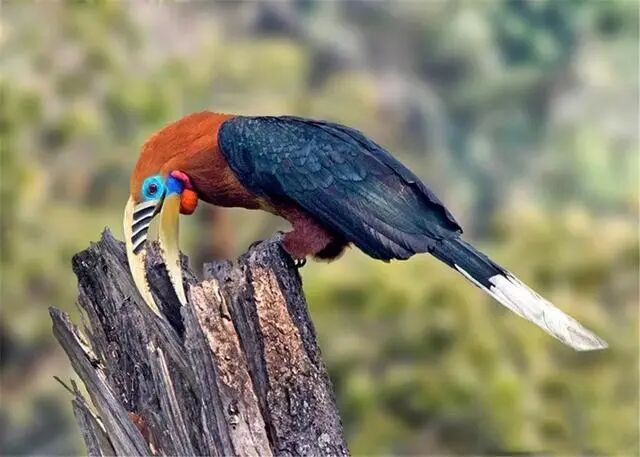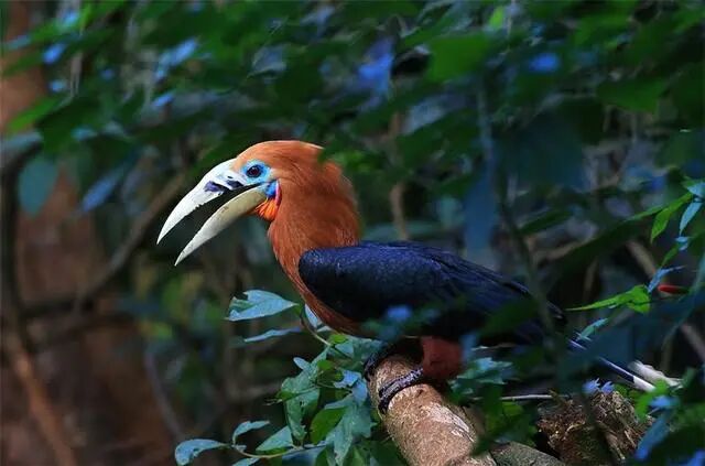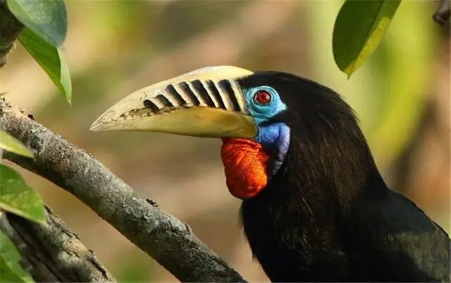 多种鲜艳的色彩,在棕颈犀鸟身上完美搭配,大嘴巴是黄色,上面有宽黑斑纹;喉囊是红色的,眼睛四周是蓝色的,犹如涂了眼影。
