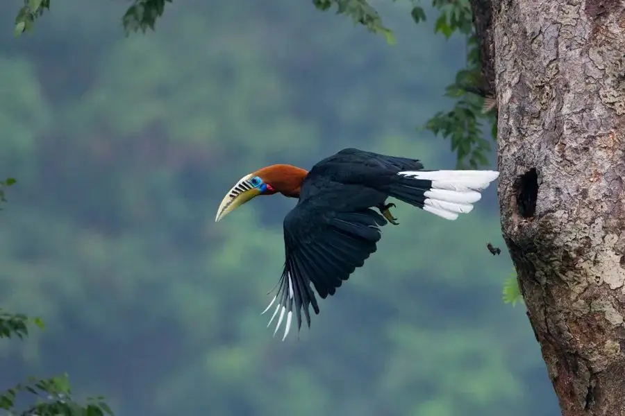一位观鸟爱好者亲眼目睹,一只雄性棕颈犀鸟口中含着野果,飞到一株大树上,通过小小的洞口,将食物喂给里面的雌鸟。