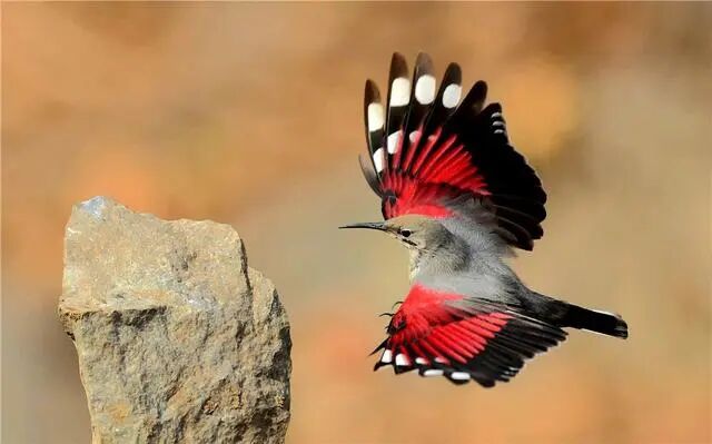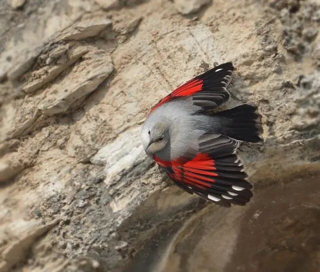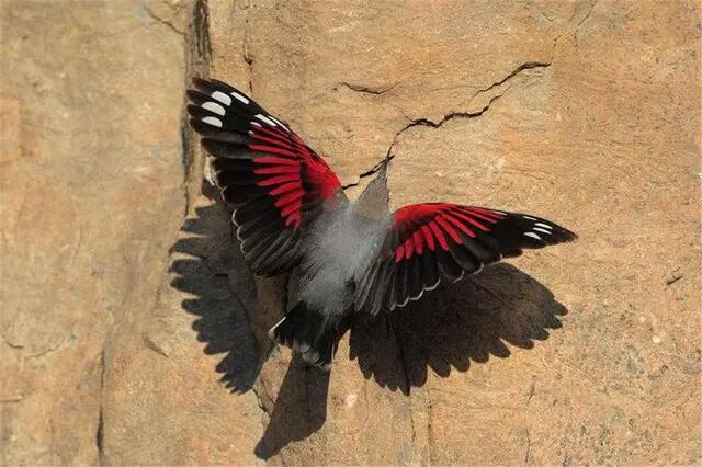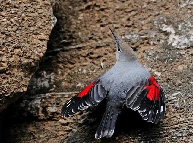 小而神秘的红翅旋壁雀,由于行为奇怪,吸引了许多鸟友的关注。一位新疆的鸟友拍到红翅旋壁雀后,兴奋地说,它飞舞的样子像美丽的蝴蝶,它在陡崖上飞檐走壁,就像电影中的“蝙蝠侠”。