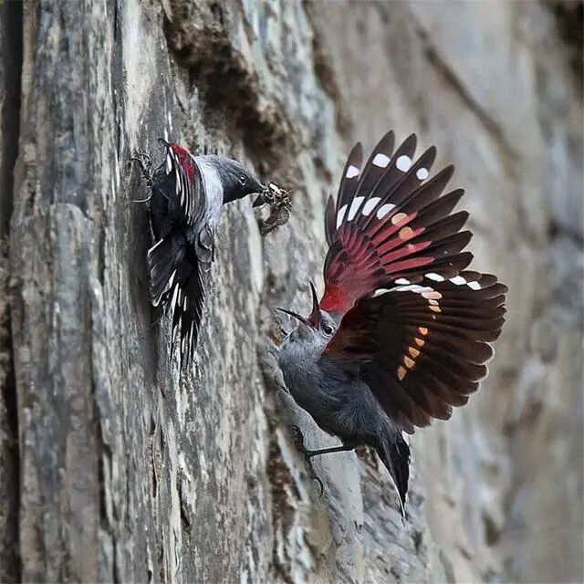 不得不说红翅旋壁雀既潇洒又有责任感,平时自个儿自由自在,一旦与雌鸟“结婚生娃”,就负责到底,真是个负责的“好男人”。它会一直照顾雌鸟与幼鸟,直到幼鸟长大,可以独自生活。