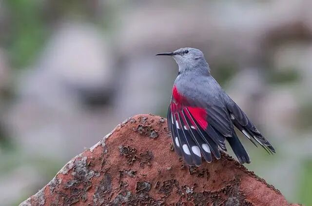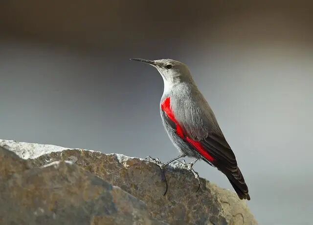 红翅旋壁雀栖息在悬崖上,体型小巧,体重在15-23克左右,主色调是灰黑色,有一定伪装作用,当它收起翅膀时,很难被发现。但是当它张开翅膀时,就会露出鲜艳美丽的翅膀。