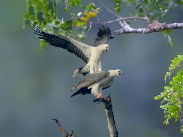雄鸟会与雌鸟一起守卫自己的领地,负责养家,还会与雌鸟一起孵卵,哺育幼鸟。幼鸟的成长速度不算快,所以需要亲鸟比较长的时间喂养、哺育。白腹海雕一家子的生活时光,十分有爱。