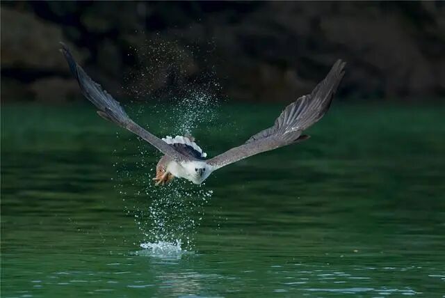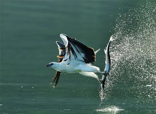 有时候独自捕食,有时候夫妻一同出动。它们会在水面上空梭巡,发现猎物,就会箭一般划过水面,只见激起一片水花,当白腹海雕再度起飞时,爪上已经多了一条海鱼。