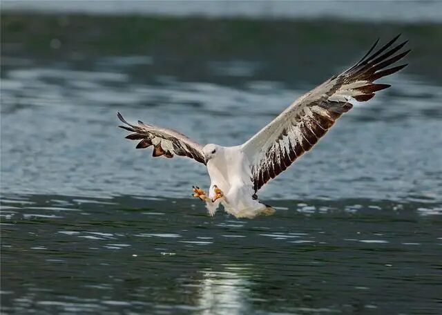 白腹海雕捕捉猎物时,双翅呈现V形向上伸直,双脚会向前伸,露出锋利如刀的爪子,头部也会向前伸,形成一个大写字母“C”形,猛禽的威名就是从捕猎中树立起来的。