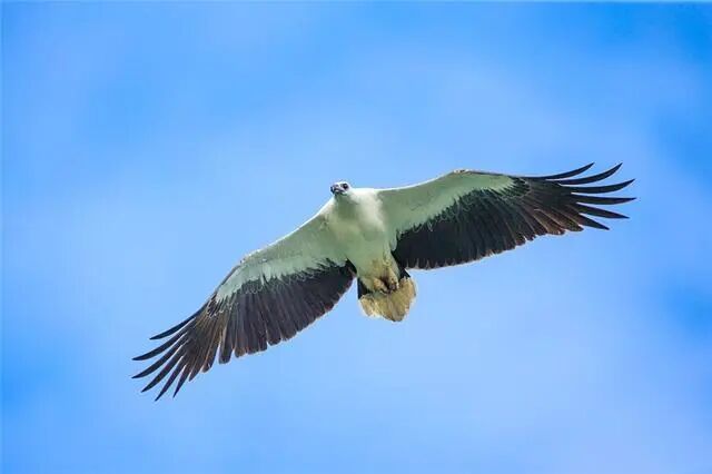 白腹海雕,又叫白胸海雕,因为它头部、颈部、胸部及尾部,都是白色的,因此得名。一双翅膀是黑色,与洁白的腹部形成鲜明对比。
