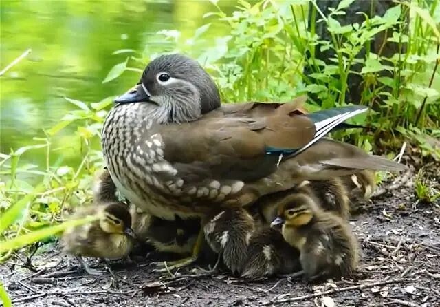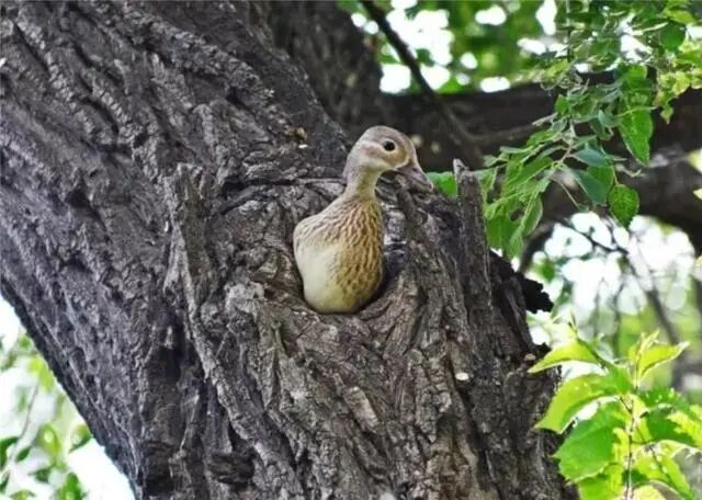 小鸳鸯一孵出来,身上就长满了毛茸茸的羽毛,孵出第二天,鸳鸯妈妈醒来的特别早,特意把还在睡梦中的幼崽都叫醒,然后在巢里鸣叫老半天,似乎在告诉小宝贝们:今天我们就要从洞中飞出去了,你们不用怕,跟着我跳就是了。