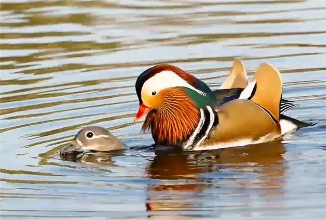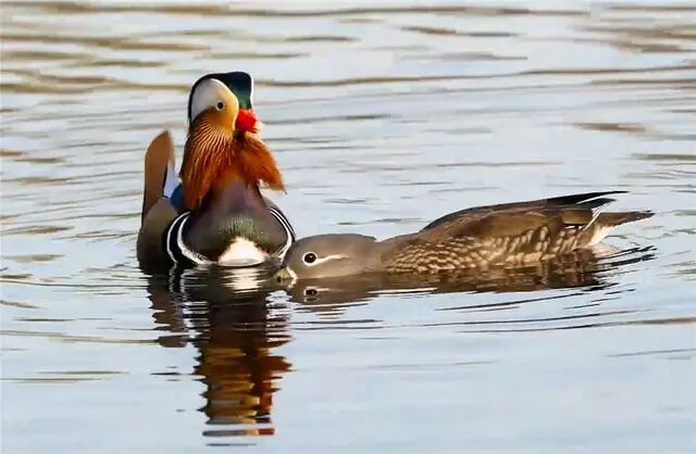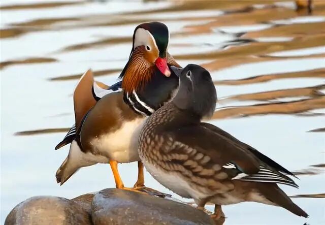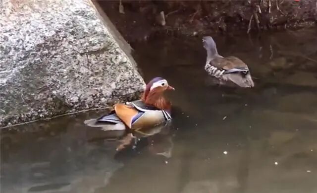 游了大约十多分后,雌鸳鸯开始加快了游泳的速度,快速向前游去,不断地翘起自己的尾巴,雄鸳鸯不甘自弱,立即追了过去。追上后就势一跃,趴在雌鸳鸯的背上,用鲜红的嘴巴衔住雌鸳鸯的头羽(此处省略100字)。