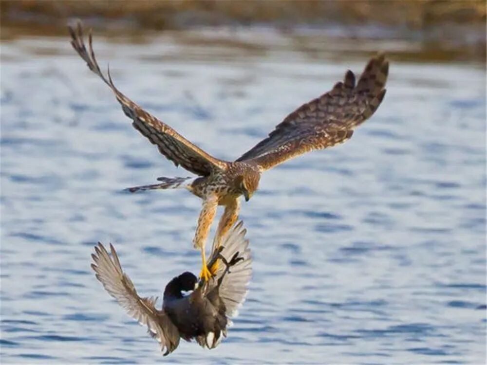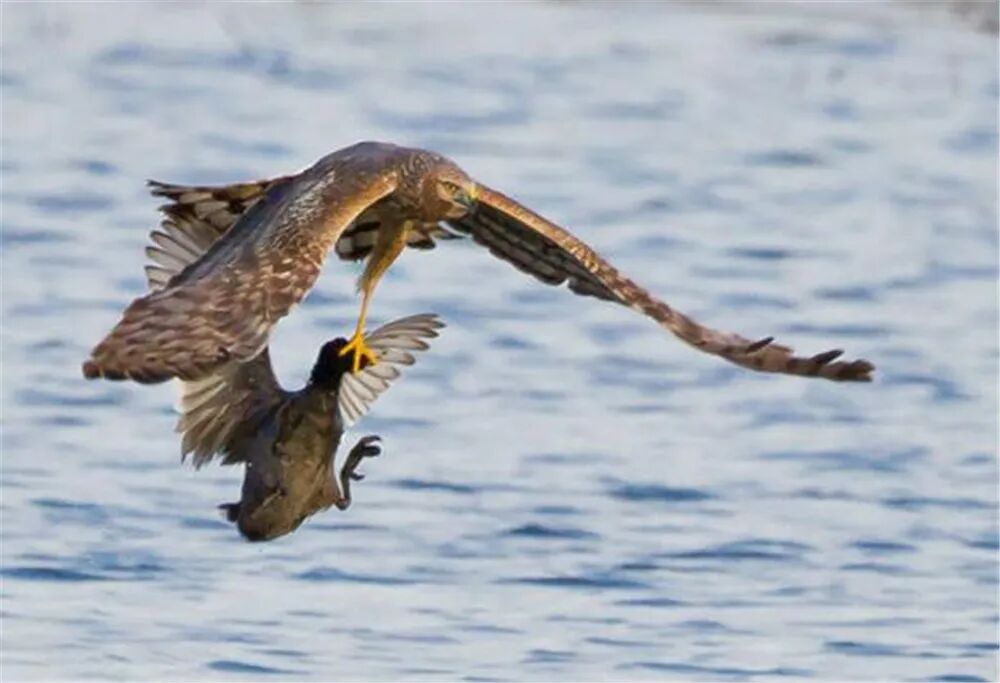 突然,白尾鹞在不远处停了下来,原来不知道什么时候湖面上出现了一只黑水鸡,也许是太饿吧,白尾鹞伸开爪子对着黑水鸡冲了下去。一只爪子抓住黑水鸡的脑袋,另一个爪子也没有闲着,紧紧抓住黑水鸡的翅膀。黑水鸡不可能就这么被抓,在水面上挣扎了好一会儿,最终没能逃过白尾鹞的魔掌。