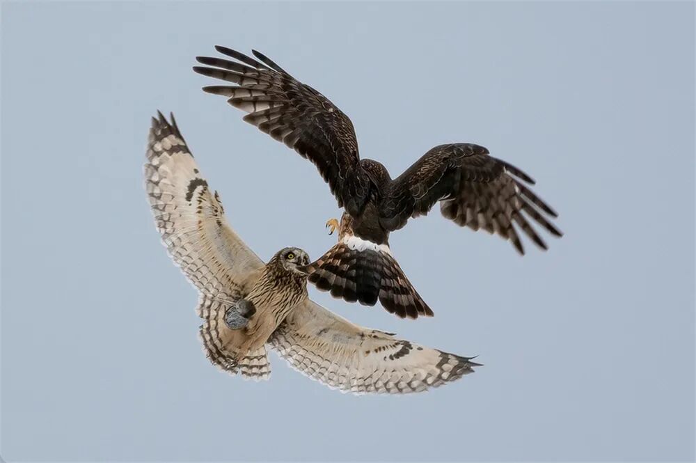 有人还目睹了一只白尾鹞盯上了短耳猫头鹰刚捕获的一只大田鼠,两只威猛的猎手在高空中展开激烈战斗,猫头鹰忙着防御,爪子一松,可怜的小田鼠当即坠落,而白尾鹞和猫头鹰还在忘我地纠缠厮杀。
