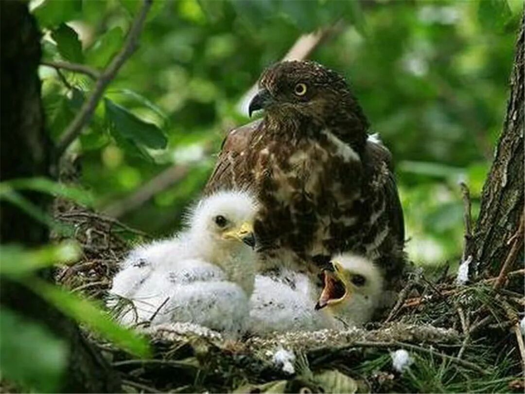 育雏期有一个半月左右,雌鸟每天飞出去给雏鸟带回来了营养丰富的蜂巢,里面并没有蜂蜜,却有着富含白质和矿物质的蜂蛹。凤头蜂鹰的雏鸟和别的猛禽不同,进食时一般不会大打出手,妈妈带回来的蜂巢,雏鸟都会得到平等分配。