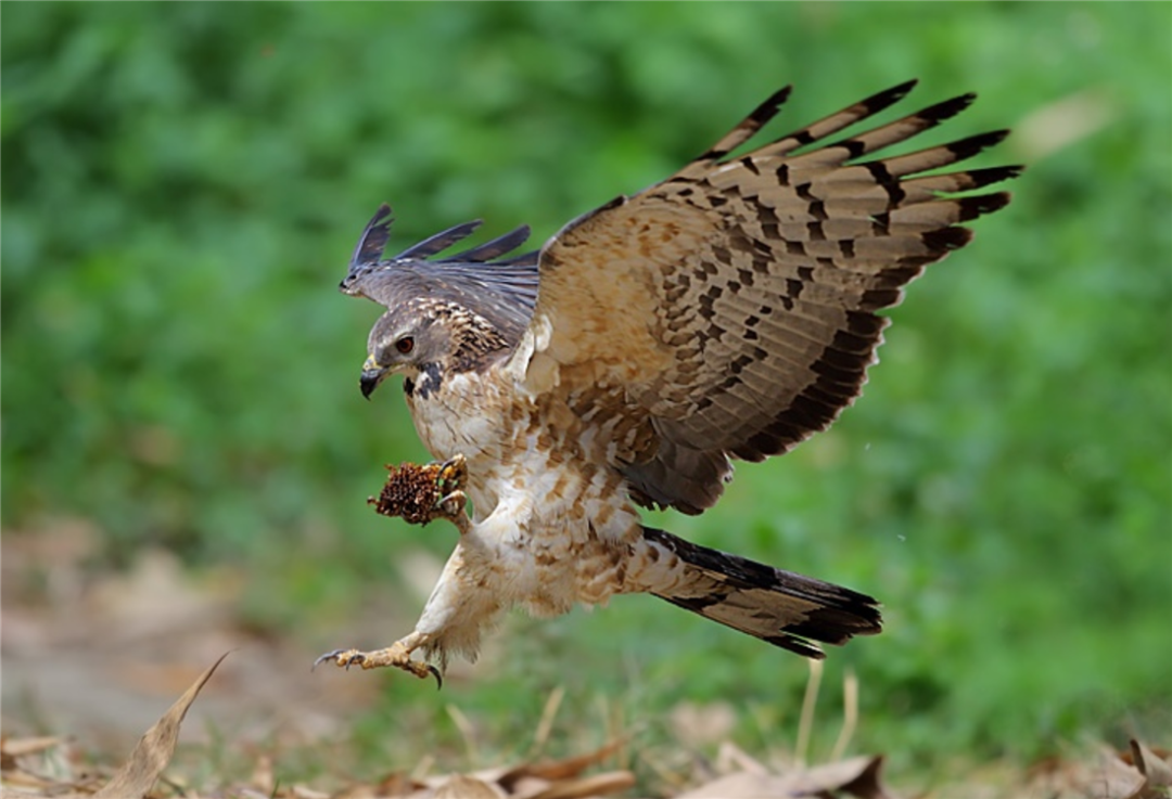 真是蜜蜂的克星!凤头蜂鹰常用鹰爪在林中的树上或者地上刨掘蜂窝,与家里的鸡刨食一个样,啄食蜂巢中的各种食物,酒醉饭饱后还直接用利爪把蜂巢撕裂成许多小块,直接带走放在家里藏着等饿了再吃。