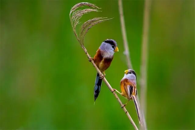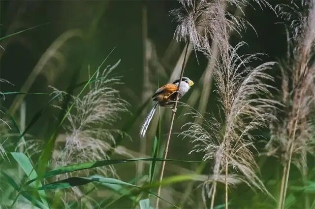有一种小鸟不喜欢待在森林里,也不爱飞上高空,专门喜欢待在江河边的芦苇荡里。最近, 在河北省武强县天平沟的芦苇丛中,出现了一对震旦鸦雀。两只小巧玲珑的震旦鸦雀形影不离,一起觅食、嬉戏。