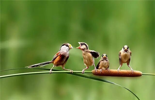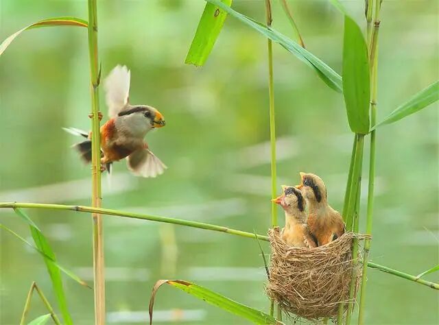 如果没有被大杜鹃借巢生蛋,震旦鸦雀雌雄亲鸟共同育雏,照顾几只雏鸟长大,画面实在很美好。