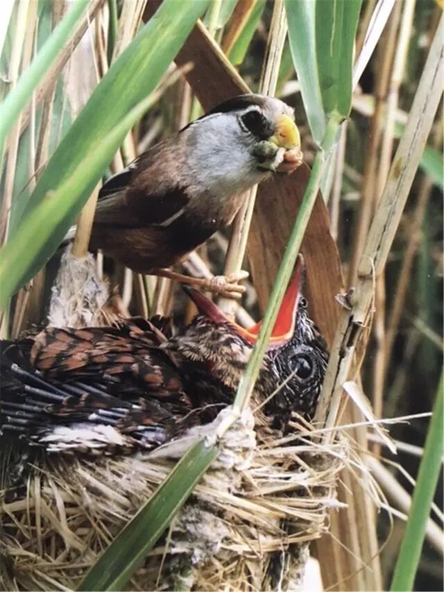 震旦鸦雀的天性使然,自己的娃没了,错将大杜鹃幼鸟当成自己的娃,每日捕食喂养,直到大杜鹃幼鸟长得比自己还大,仍然不辞辛苦喂养。