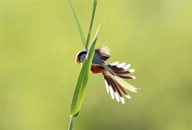 震旦鸦雀活泼机灵,总是安静不下来,嘴里不断发出“唧唧”叫声,急促而连贯,很好听。在芦苇丛中时,也像一阵风般轻盈,一眨眼就不知道飞哪儿去了。