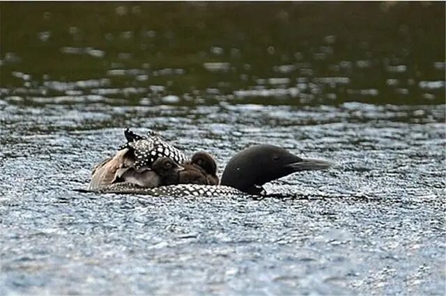 一只母潜鸟背上驮着它的宝宝在水上游来游去,公潜鸟在旁边东张西望,看看能不能找到几条小鱼当午餐吃。奇怪的是,这只母潜鸟背上的这个宝宝却不是潜鸟宝宝,而是一只小野鸭。难道是母潜鸟认错了孩子?