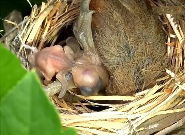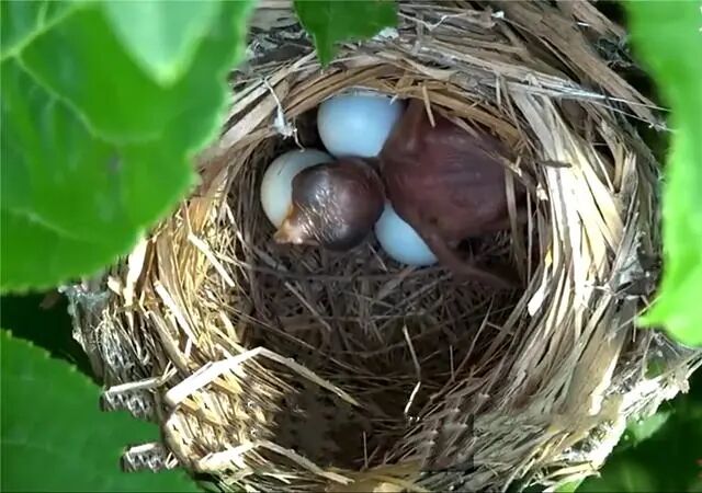 过了不久,小布谷鸟长出了羽毛,变成了一个深棕色的肥球。2只小伯劳出壳,小布谷鸟也毫不留情,它用背把毫无反抗能力的伯劳雏鸟一只一只推出巢外,任由它掉到地上摔死。达到目的后,这个“小恶霸”独享了养父母的抚育。